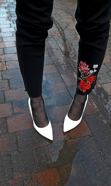Kolor różowy i haftowany kot kreuje dziewczęcy look, który postanowiłam przełamać cięższymi butami i odważniejszą biżuterią w postaci chokera z perłami, perły zostały też wykorzystane na nadgarstku. Dzięki dodatkom nadałam całości nieco ostrzejszy i rockowy charakter.